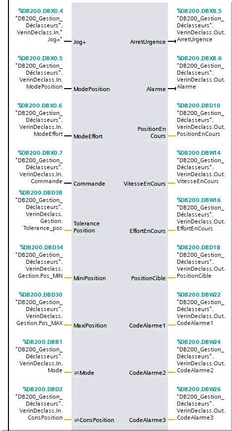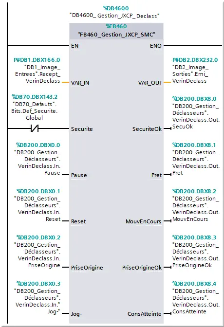 Le DB4600_JXCP_Declass est un bloc fonction (FB) gérant la logique de commande et de sécurité du vérin vertical, dans un contexte d'insertion/prise de pièces. Il utilise un DB45 pour les paramètres spécifiques et un DB200 pour stocker les états et paramètres.